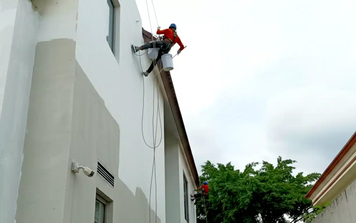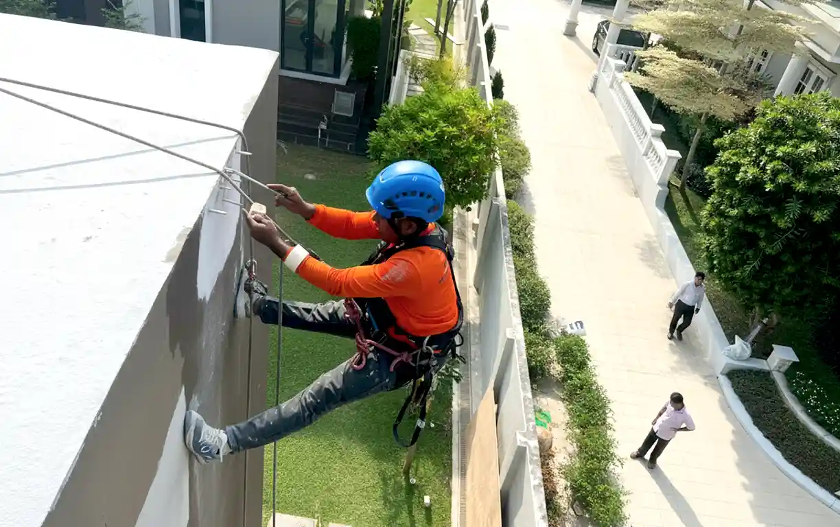 Rope access can assist with roof repair, roof waterproofing, wall seepage repair, spray coating operations, façade repair, external wall painting, and selected re-roofing work. Enabling exact work directly on the trouble spot.